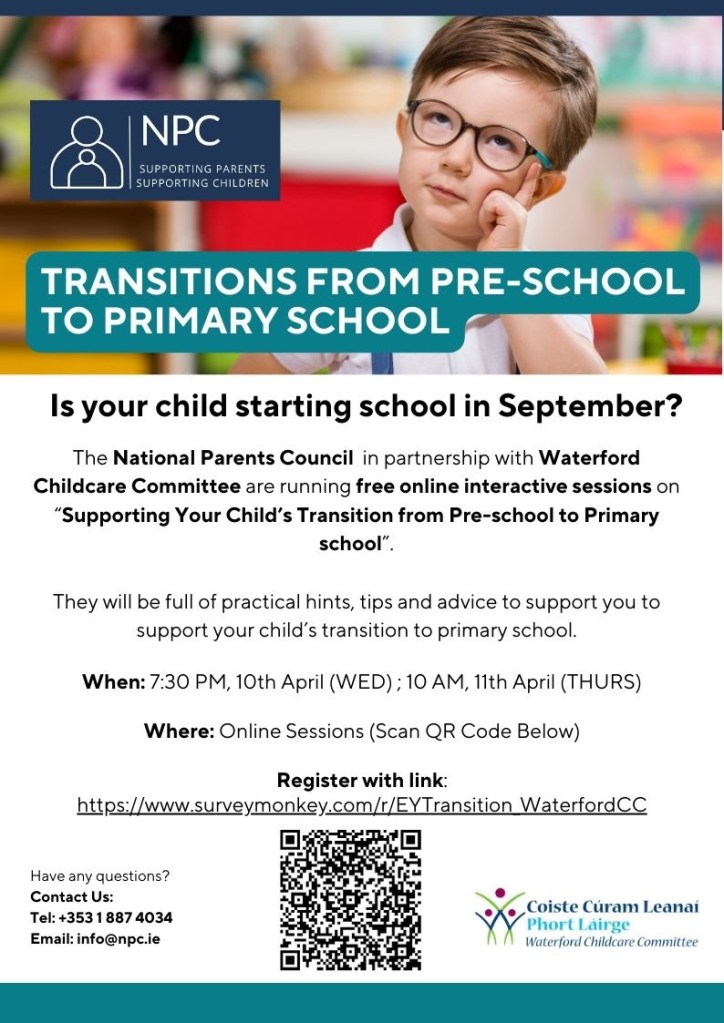 National Parents Council in partnership with Waterford Childcare Committee are running free online interactive sessions on “Supporting Your Child’s Transition from Pre-school to Primary school” next Wednesday and Thursday, the 10th and 11th of April.